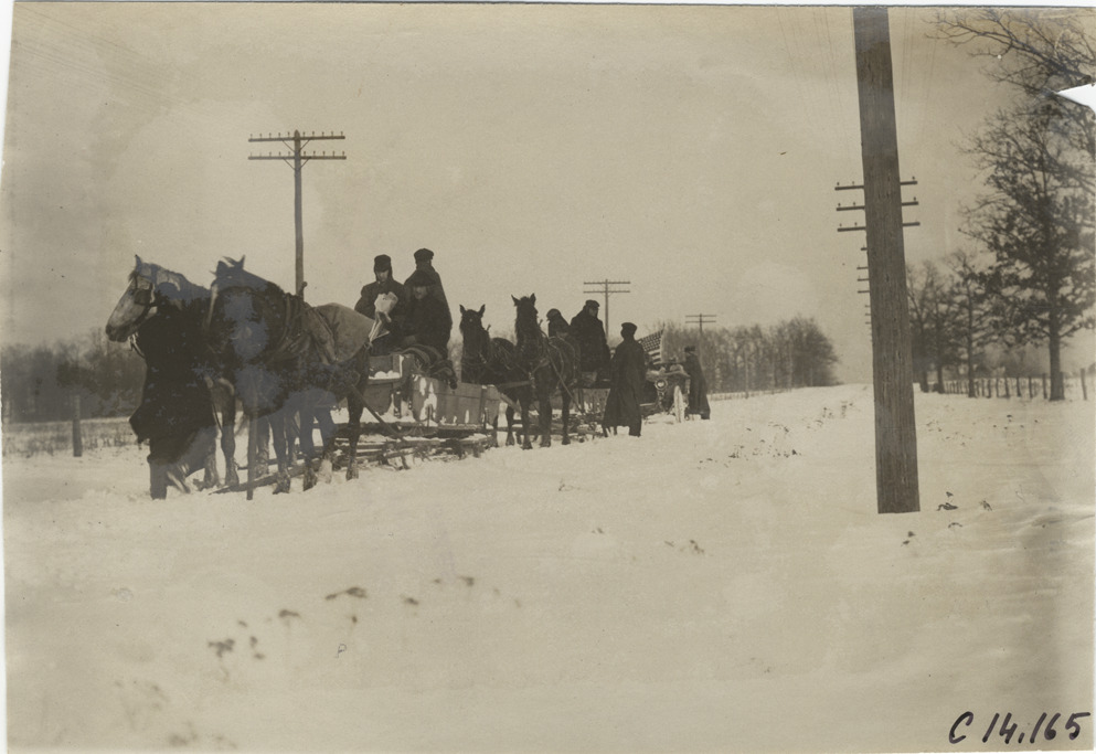 Horse-drawn wagon towing Thomas Flyer automobile on snow-covered road, 1908 New York to Paris Race