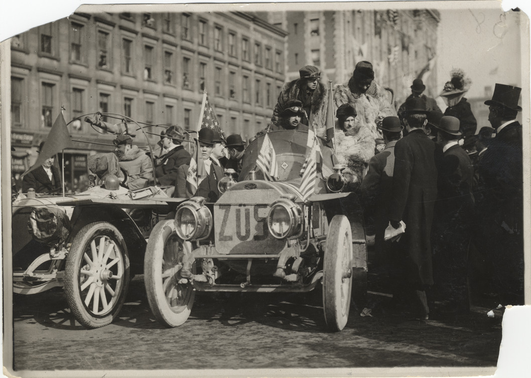View of motorists in Zust car during 1908 New York to Paris Race. Group of men stand next to car; Zust car is parked next to Thomas Flyer automobile. Stamped on back: "Spooner and Wells, 1931 Broadway, New York, duplicates any time, enlargements all sizes, tel. 3472-3473 Col., credit appreciated." Handwritten on back: "Races and racing--New York to Paris Race, 1908."