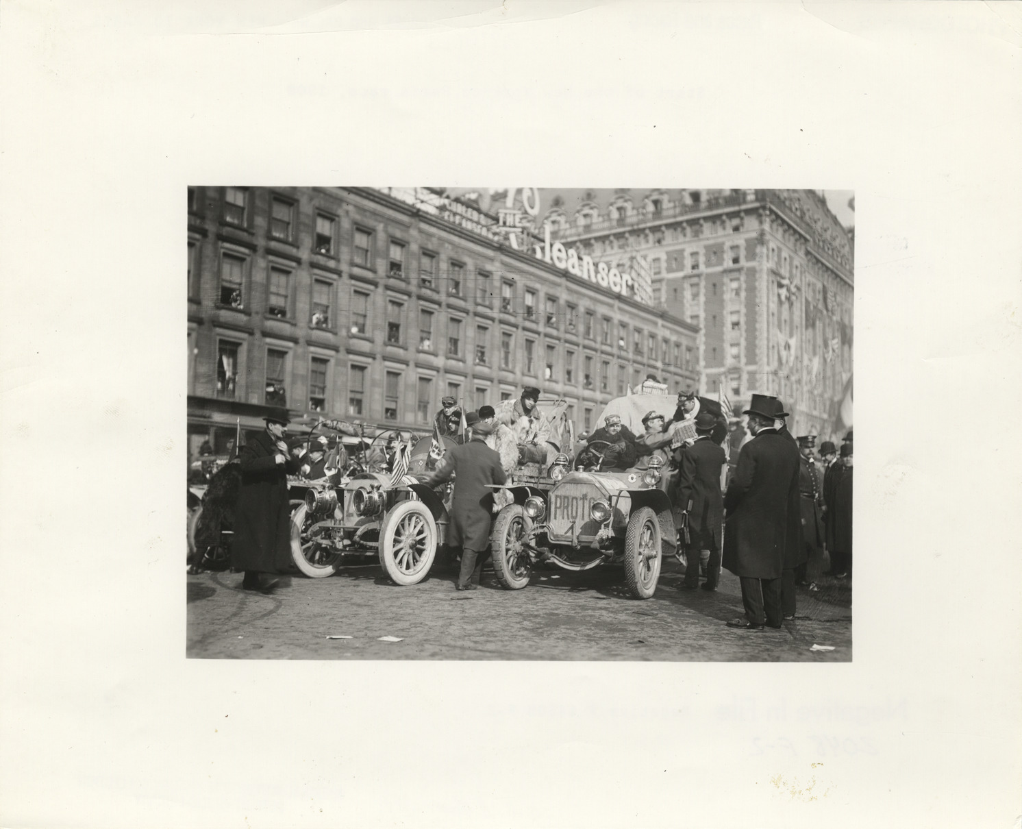 Motorists in Zust and Protos cars at start of 1908 New York to Paris Race. Buildings in background. Typed on back: "Start of the New York to Paris race, 1908." Handwritten on back: "Races and racing--New York to Paris, 1908."