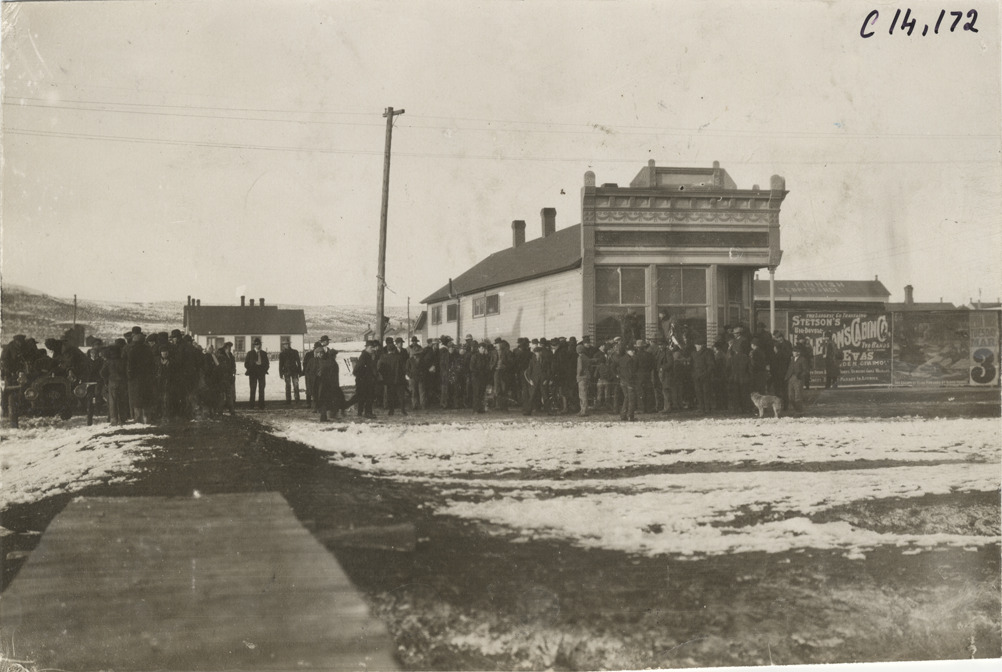 View of crowd waiting in front of wooden-frame commercial building during 1908 New York to Paris Race. Brick wall sign in background; Reo car on left. Handwritten on back: "Races and racing--New York to Paris, 1908."