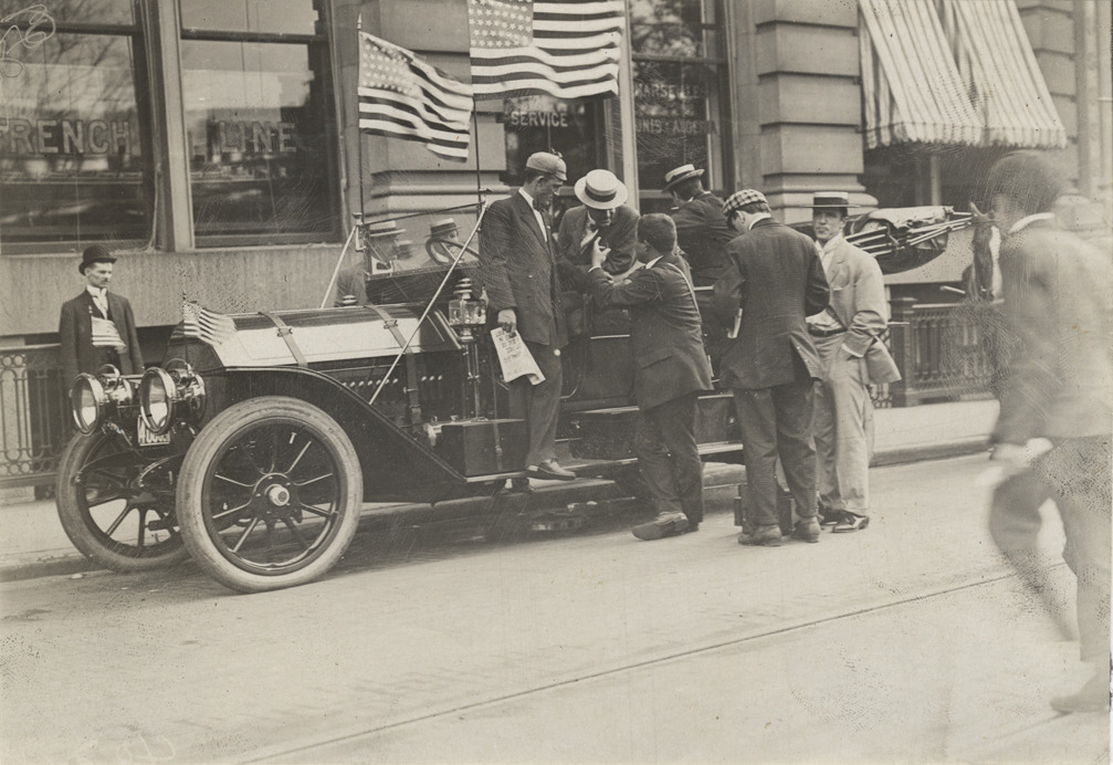 Men with automobile in front of French Line office, 1908 New York to Paris Race