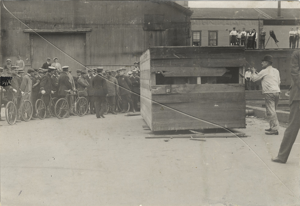 View of crowd on dock watching man dismantle large wooden crate during 1908 New York to Paris Race. Policemen in crowd have bicycles. Handwritten on back: "Races and racing--New York to Paris, 1908."