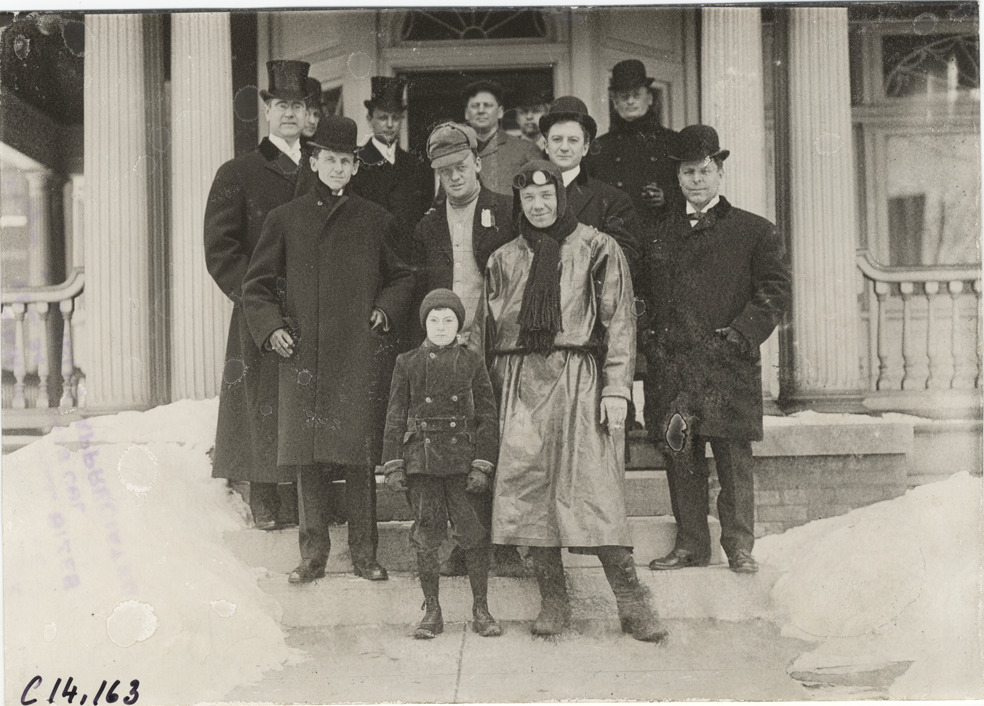 View of driver and young boy posing with group of men on steps of house during 1908 New York to Paris Race. Stamped on back: "Spooner and Wells, 1931 Broadway, New York, duplicates any time, enlargements all sizes, tel. 3472-3473 Col., credit appreciated." Handwritten on back: "Races and racing--New York to Paris Race, 1908."