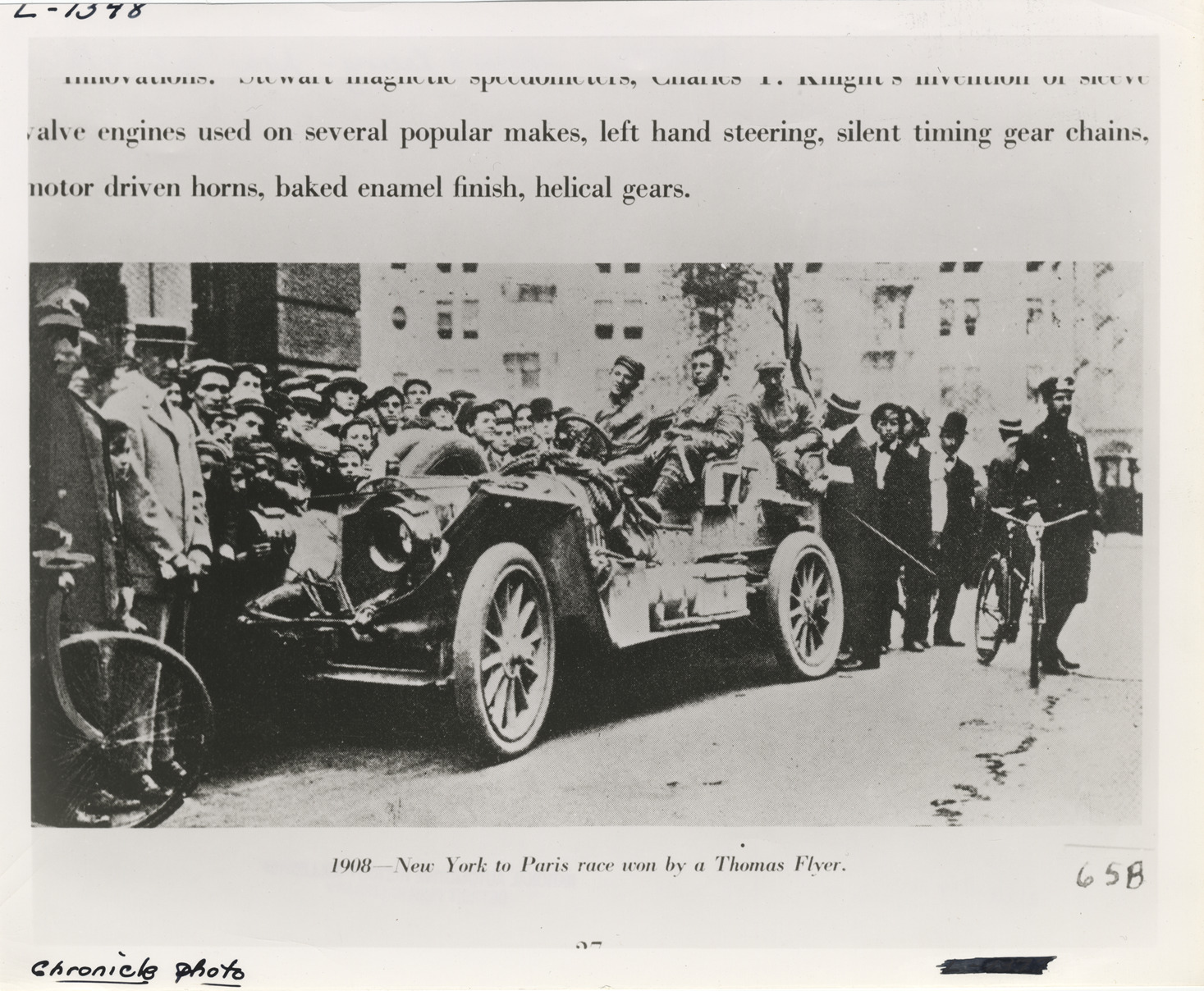 View of motorists in Thomas Flyer car during 1908 New York to Paris Race. Onlookers stand on sidewalk. Handwritten on front: "Chronicle photo." Printed on front: "1908--New York to Paris race won by a Thomas Flyer." Handwritten on back: "Races and racing--New York to Paris, 1908."