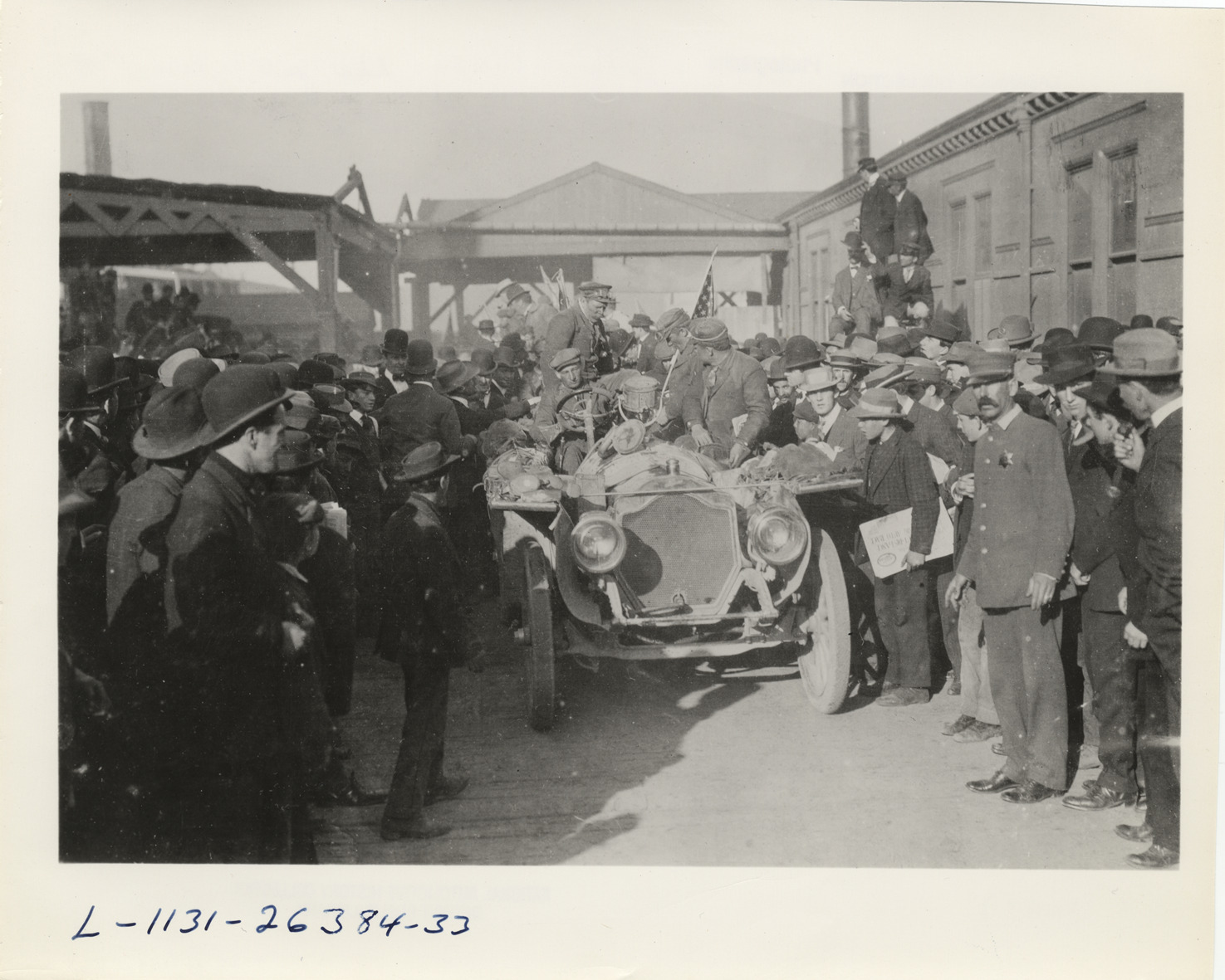 View of crowd surrounding Thomas Flyer car on Oakland ferry dock in San Francisco, California during 1908 New York to Paris Race. Typed on back: "The Thomas Flyer touches San Francisco at the Oakland ferry docks late in March 1908 on the New York-to-Paris race." Handwritten on back: "Races and racing--New York to Paris, 1908."