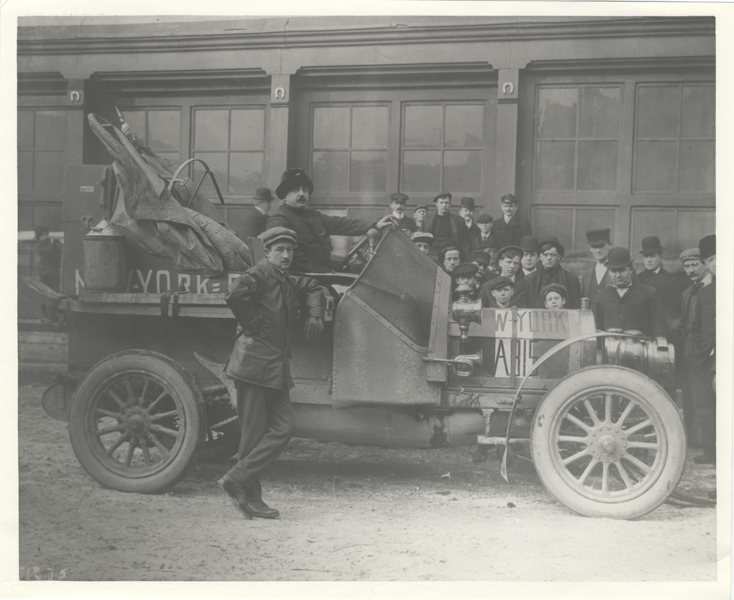 View of two motorists posing with Zust car in front of building during 1908 New York to Paris Race. Onlookers stand on sidewalk in background. Handwritten on back: "Races and racing--New York to Paris, 1908."