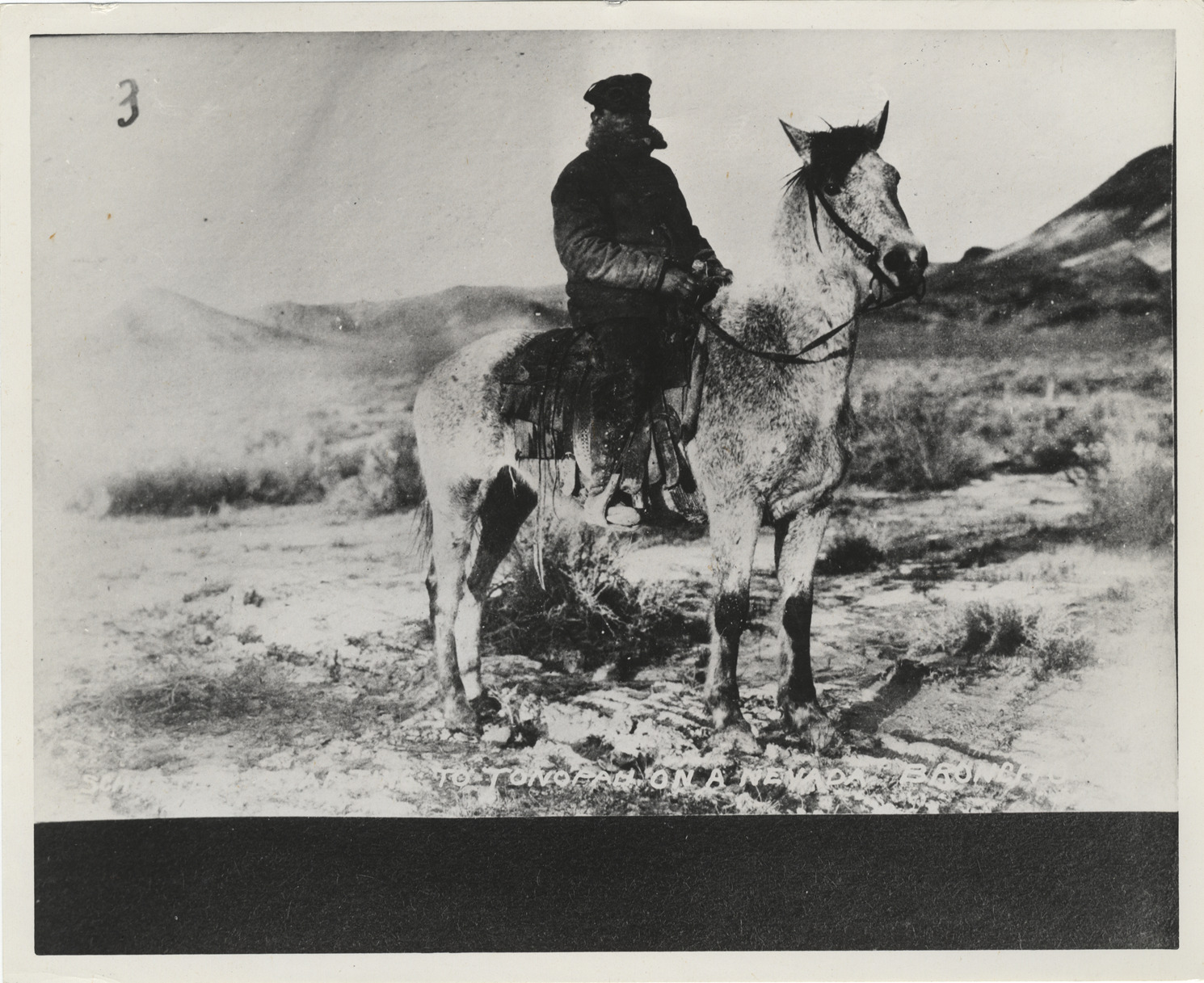 View of driver George Schuster on horseback. Handwritten on back: "Schuster about to start from Twin Springs ranch for repair parts at Tonapah. Handwritten on back: "Races and racing--New York to Paris, 1908."