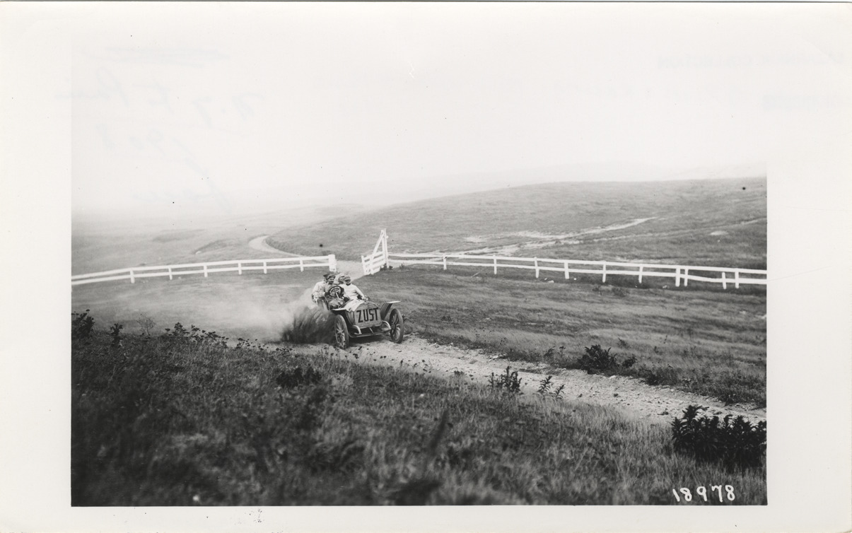 View of motorists in Zust car traveling on rural road during 1908 New York to Paris Race. Printed on front: "New York to Paris Race, 1908." Handwritten on back: "Races and racing--New York to Paris, 1908."