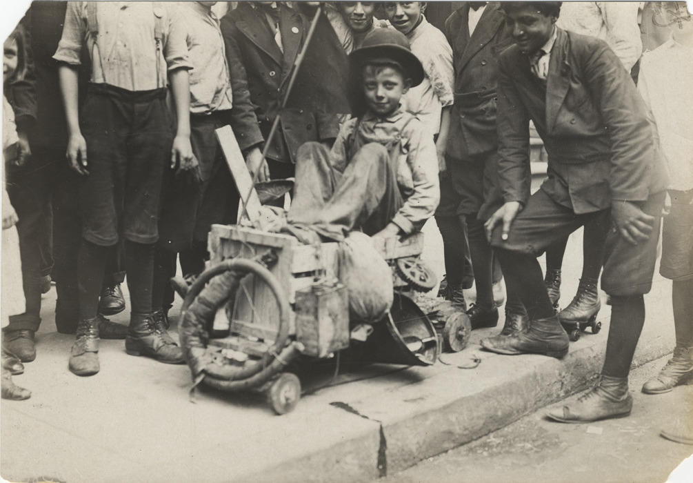 View of boy posing in soap box derby racer or go-cart, surrounded by other boys, during 1908 New York to Paris Race. Stamped on back: "Spooner & Wells, Inc., photographers, telephones 3472-3473 Columbus, 1931 Broadway, New York." Handwritten on back: "Races and racing--New York to Paris, 1908."