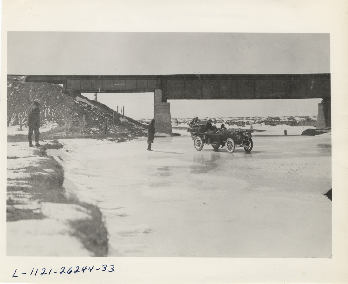 View of Thomas Flyer car crossing frozen Medicine Bow River in Wyoming during 1908 New York to Paris Race. Union Pacific Railroad bridge in background. Typed on back: "The Thomas car crossing the Medicine Bow River (Wyo.) where it is ten feet deep near a Union Pacific RR bridge, to save a long detour on the 1908 New York-to-Paris race." Handwritten on back: "Races and racing--New York to Paris, 1908."