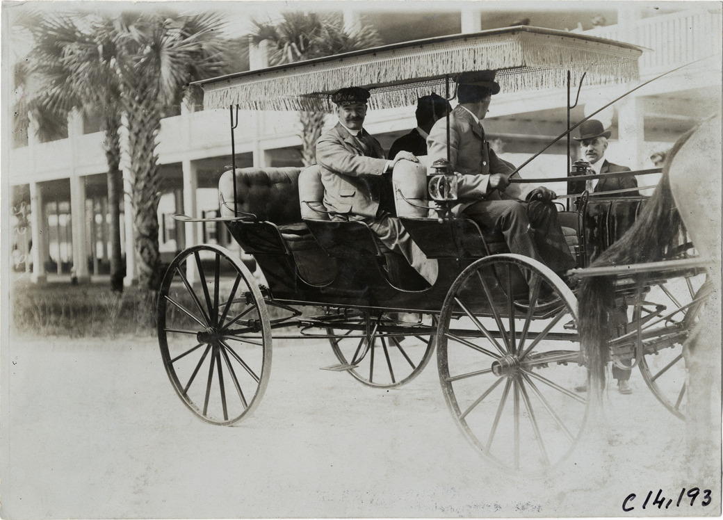 View of Sir Thomas Dewar, donor of the Dewar Cup trophy, in surrey with driver and another passenger during the 1905 Ormond-Daytona races in Florida. Handwritten on back: "Foto by Spooner. Sir Thomas Dewar [undecipherable]. Races and racing--Ormond-Daytona, 1905."