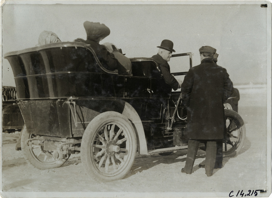Rear view of spectators in car on beach during the 1905 Ormond-Daytona races in Florida. Handwritten on back: "Races and racing--Ormond-Daytona, 1905."