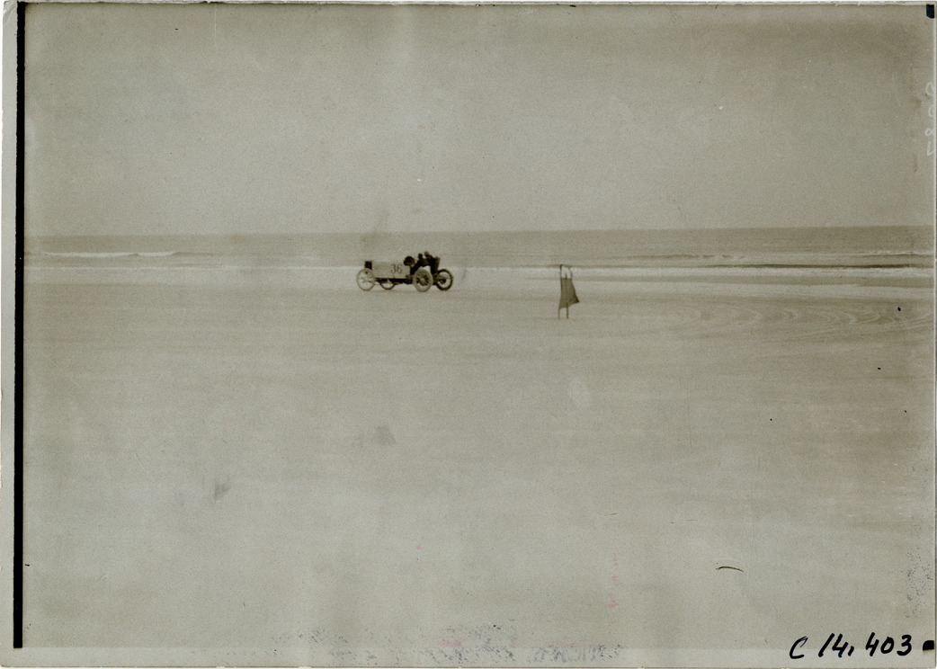 Distant view of driver and passenger racing De Dietrich car no. 36 on beach during the 1905 Ormond-Daytona races in Florida. Handwritten on back: "#36 De Dietrich. Races and racing--Ormond-Daytona, 1905."