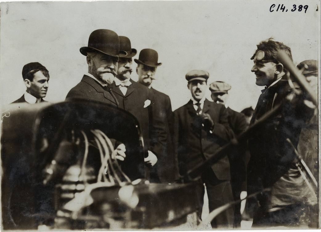 Driver and officials with Pope-Toledo racecar, 1905 Ormond-Daytona races