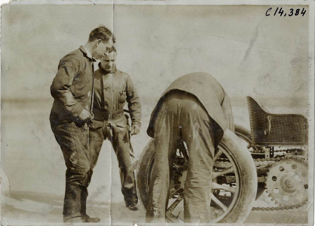 Crew working on Simplex racecar, 1905 Ormond-Daytona races