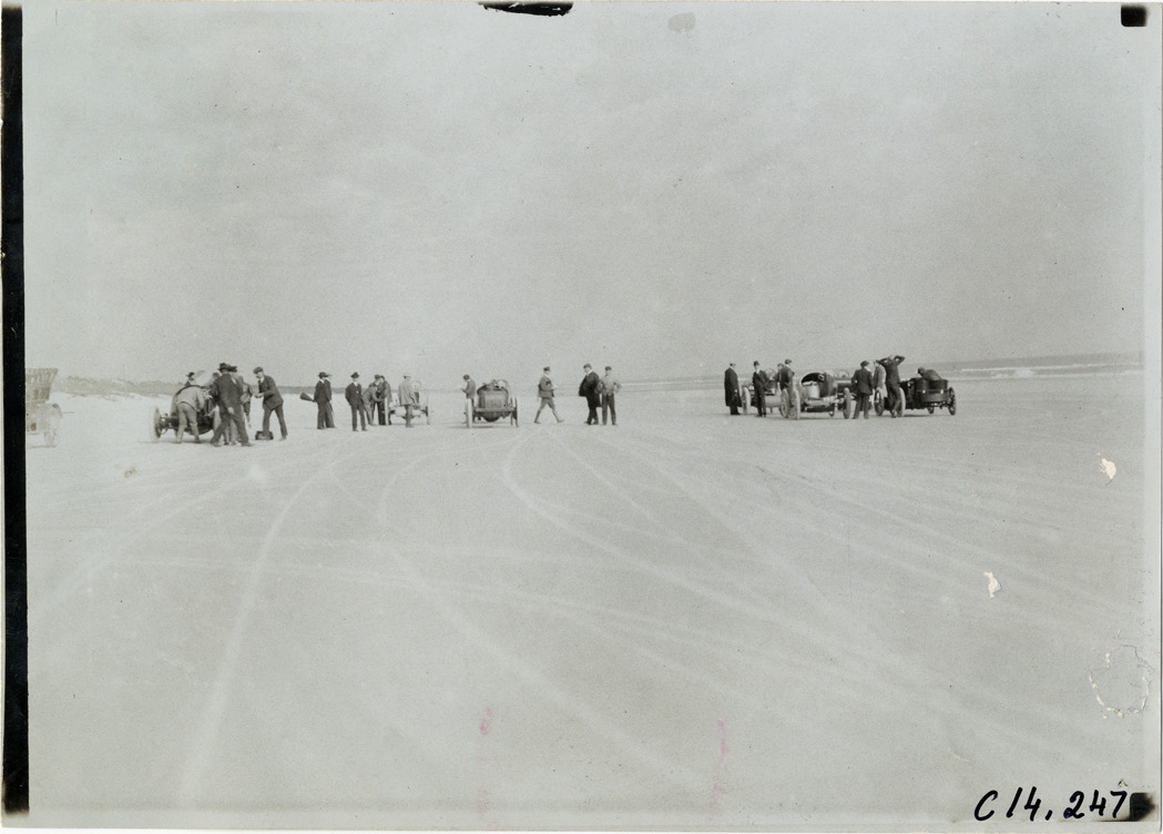 Distant view of cars on beach lined up for event during the 1905 Ormond-Daytona races in Florida. Spectators and officials stand around cars. Handwritten on back: "Races and racing--Ormond-Daytona, 1905."