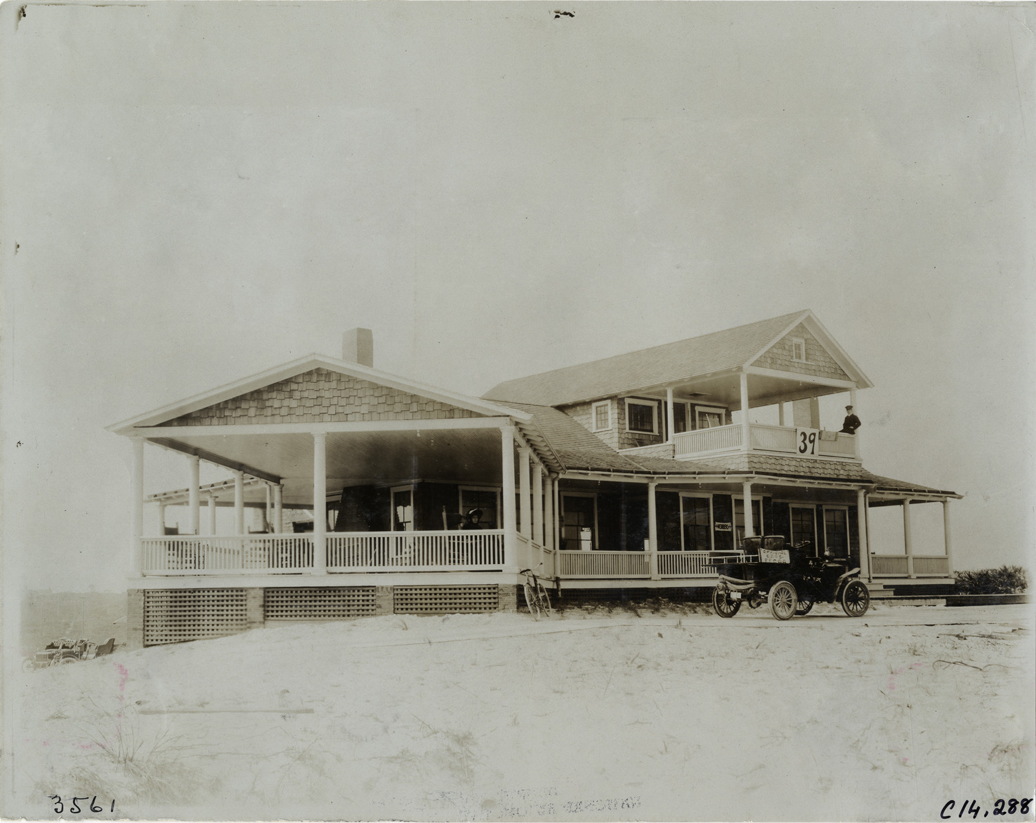 View of clubhouse on beach during the 1905 Ormond-Daytona races in Florida. "Members" sign displayed next to door; man sits on second-floor balcony. Car with "Official cars FECAA" sign parked in front of clubhouse. Handwritten on back: "Clubhouse. Races and racing--Ormond-Daytona, 1905."