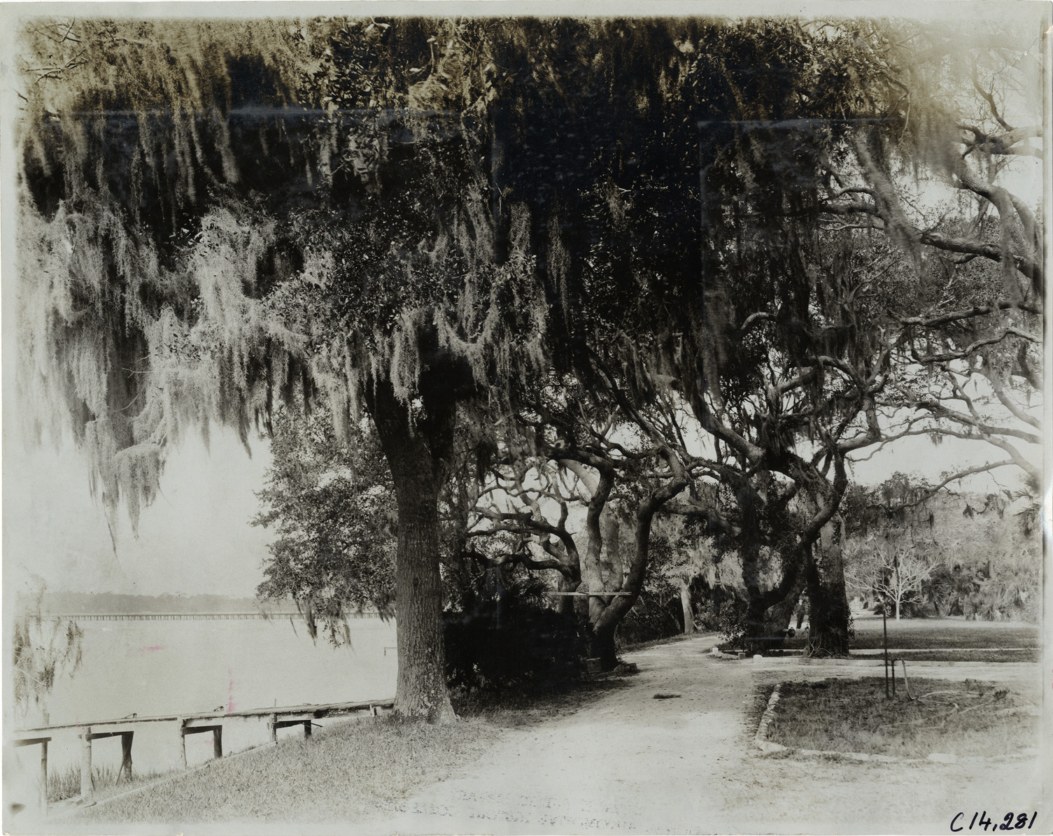 View of trees covered with Spanish moss on banks of river during the 1905 Ormond-Daytona races in Florida. Handwritten on back: "Surrounding area. Races and racing--Ormond-Daytona, 1905."