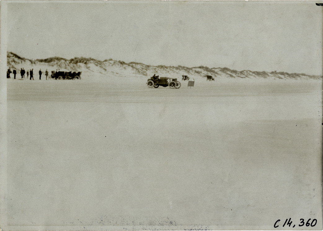Distant view of driver and passenger racing De Dietrich car no. 41 on beach during the 1905 Ormond-Daytona races in Florida. Handwritten on back: "#41 90 h.p. De Dietrich, entered by O.F. Thomas. Races and racing--Ormond-Daytona, 1905."