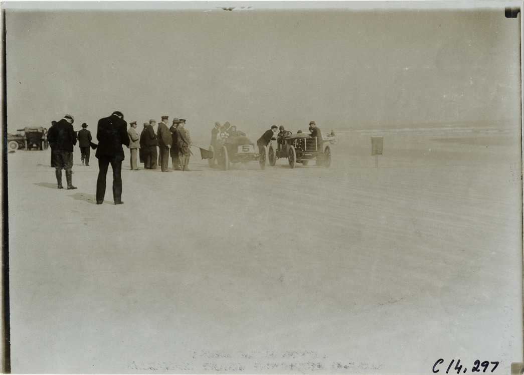 Napier and De Dietrich racecars at starting line for 10 mile handicap race, 1905 Ormond-Daytona races