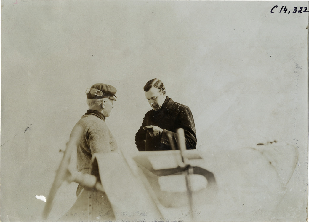 E.R. Thomas and man standing next to Mercedes racecar, 1905 Ormond-Daytona races