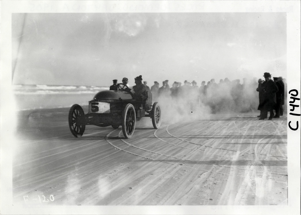 Driver and passenger in Napier racecar, 1905 Ormond-Daytona races