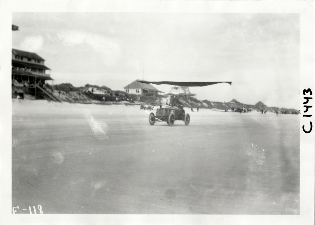 View of driver and passenger racing De Dietrich car no. 41 on beach during the 1905 Ormond-Daytona races in Florida. Buildings in background. Handwritten on back: "#41, De Dietrich. Races and racing--Ormond-Daytona, 1905."