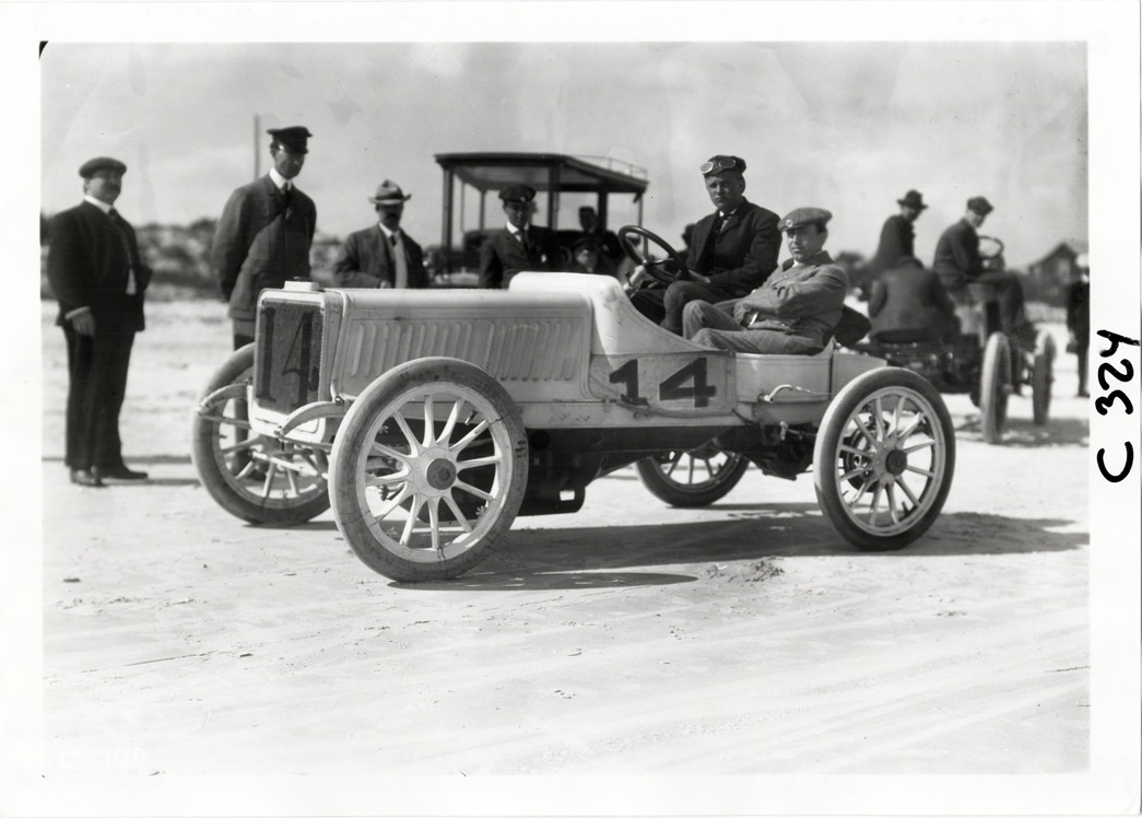 Driver and passenger in Decauville racecar, 1905 Ormond-Daytona races
