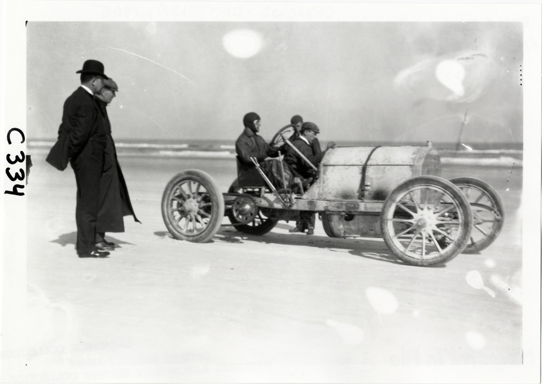 William Wallace and passenger in Fiat racecar, 1905 Ormond-Daytona races