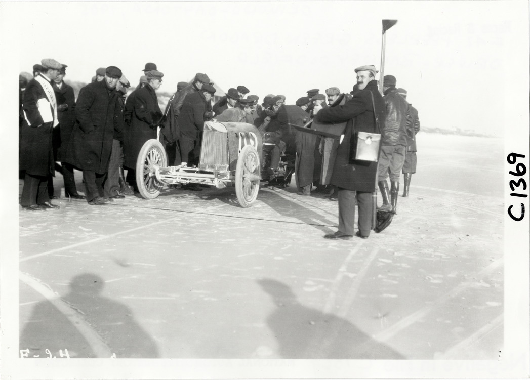 Crowd surrounding Barney Oldfield in Peerless Green Dragon racecar, 1905 Ormond-Daytona races