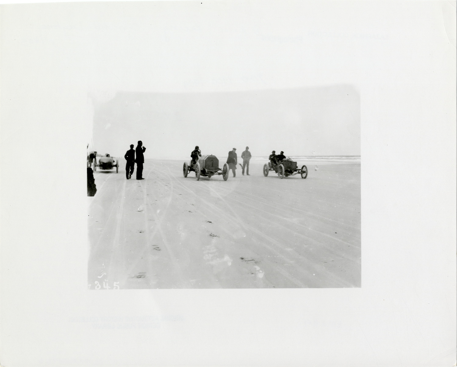 View of officials standing near three cars on beach during the 1905 Ormond-Daytona races in Florida. Handwritten on back: "Races and racing--Ormond-Daytona (Misc. activities), 1905."