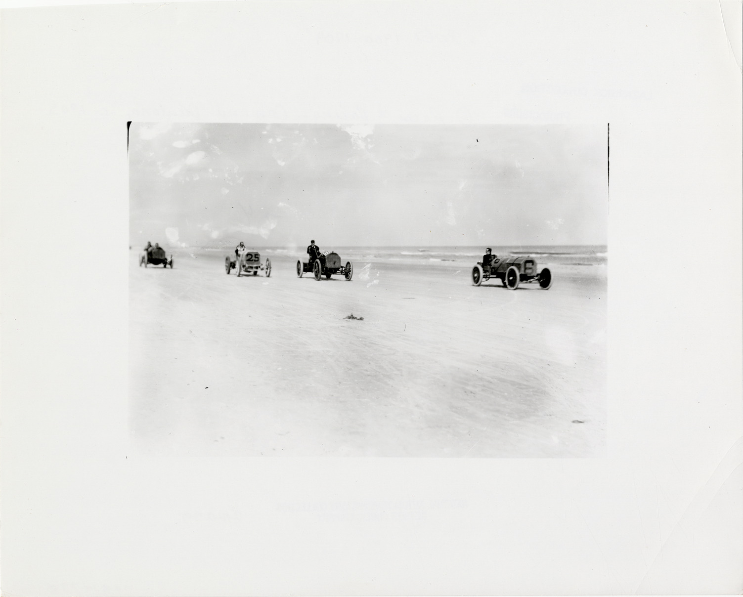 View of four cars, including car no. 25 and car no. 6, racing on beach during the 1905 Ormond-Daytona races in Florida. Handwritten on back: "Races and racing--Ormond-Daytona (Misc. activities), 1905."