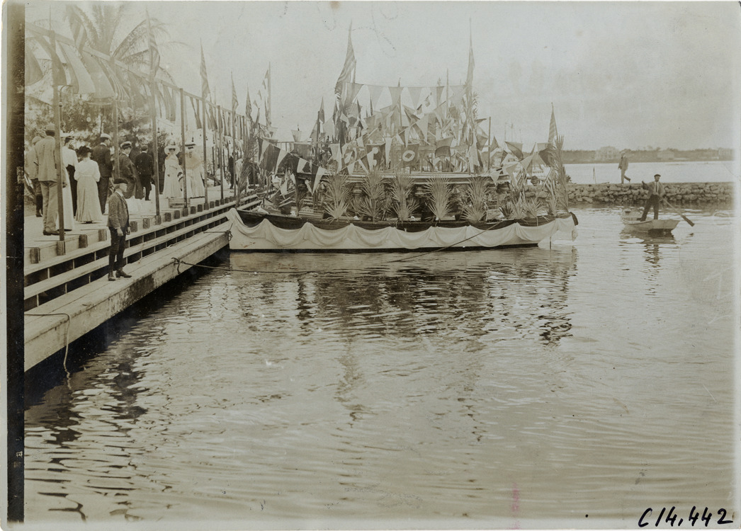 Boat decorated with flags and palm fronds, 1905 Palm Beach boat races