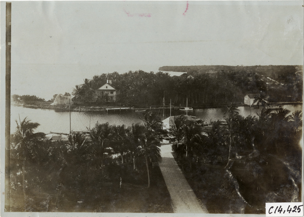View of landscape with boats on water, palm trees and road during the 1905 Ormond-Daytona races in Florida. Handwritten on back: "Races and racing--Ormond-Daytona (Misc. activities), 1905."