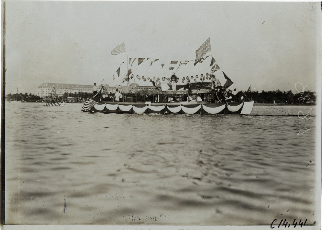 Boat decorated with flags and lanterns, 1905 Palm Beach boat races