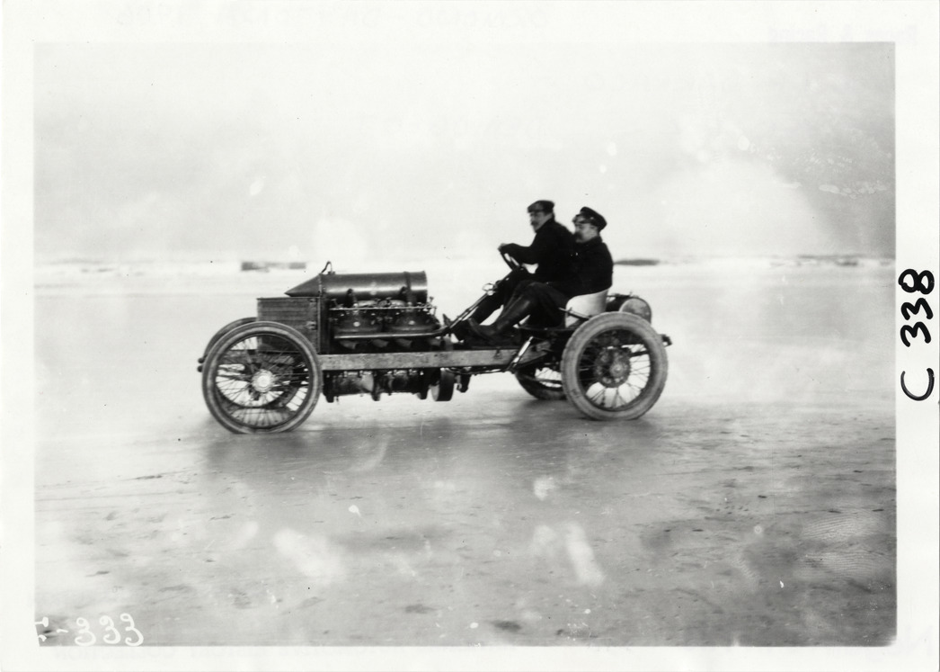 Victor Demogeot and passenger in Darracq racecar, 1906 Ormond-Daytona races