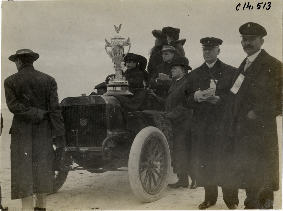 Motorists in automobile with Minneapolis Cup trophy, 1906 Ormond-Daytona races