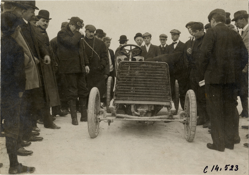 Victor Hemery and crowd surrounding racecar, 1906 Ormond-Daytona races