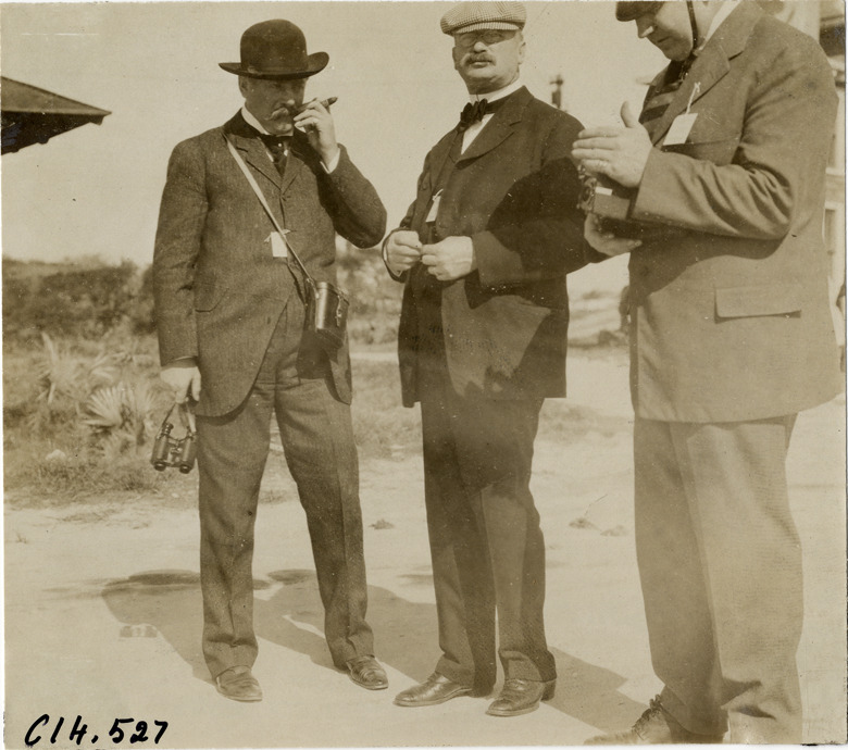View of George W. Young and two racing officials, wearing badges, during the 1906 Ormond-Daytona races in Florida. George W. Young holds binoculars and a cigar. Handwritten on back: "Races and racing--Ormond-Daytona, 1906."