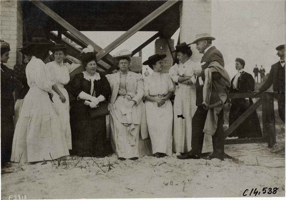 View of Mr. Day and group of women on beach next to grandstand during the 1906 Ormond-Daytona races in Florida. Stamped on back: "Photo by N. Lazarnick, 29 West 42nd Street, New York." Handwritten on back: "Mr. Day & party at grandstand, Ormond. Races and racing--Ormond-Daytona, 1906."