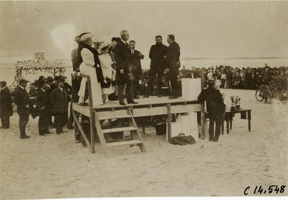 Men and women on awards platform, 1906 Ormond-Daytona races