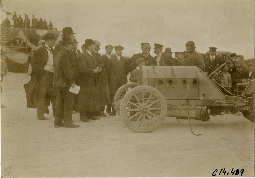Spectators standing with driver and racecar, 1906 Ormond-Daytona races