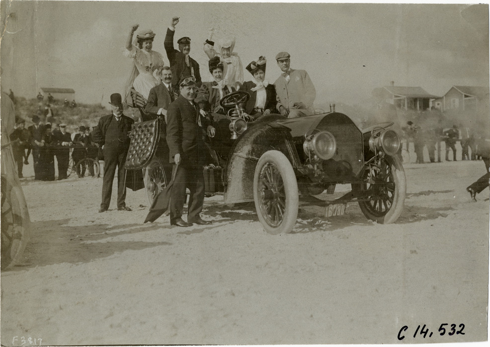 Cheering spectators with automobile, 1906 Ormond-Daytona races