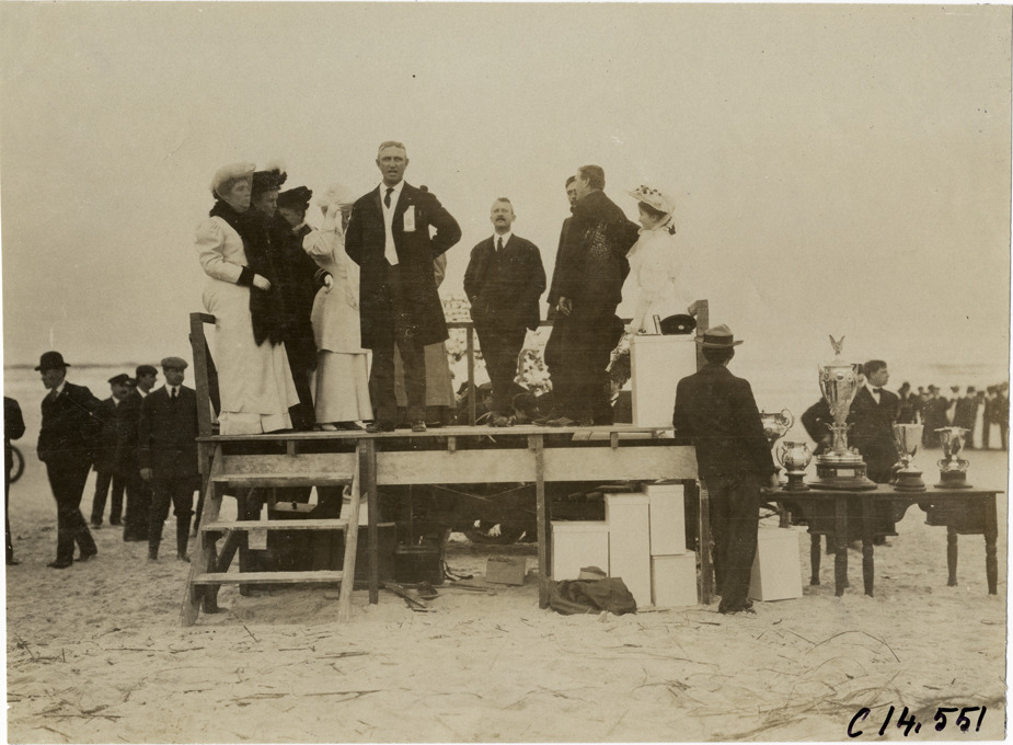 Men and women on awards platform, 1906 Ormond-Daytona races