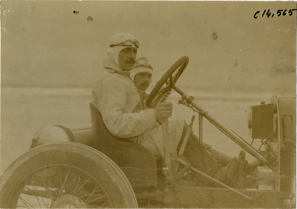 Close-up view of Clifford Earp and passenger in Napier car during the 1906 Ormond-Daytona races in Florida. Handwritten on back: "Races and racing--Ormond-Daytona, 1906."