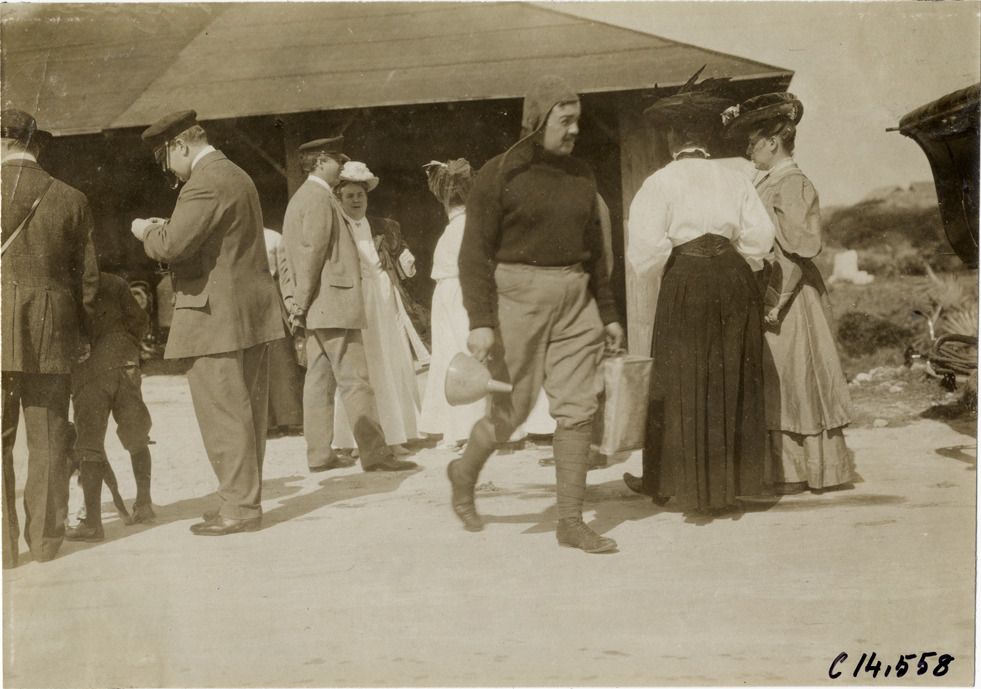 View of driver carrying oil can and funnel past group of men and women during the 1906 Ormond-Daytona races in Florida. Building in background. Handwritten on back: "Races and racing--Ormond-Daytona, 1906."