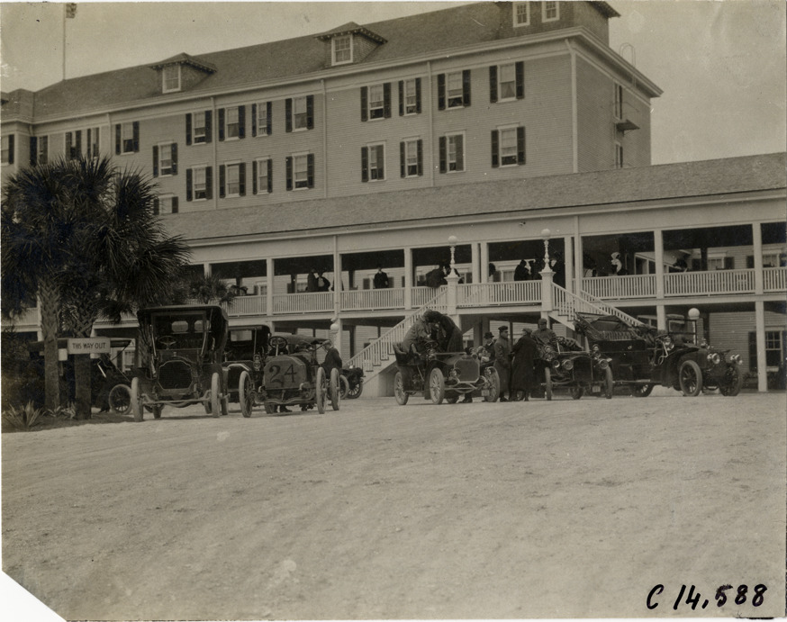 Automobiles parked in front of clubhouse, 1906 Ormond-Daytona races