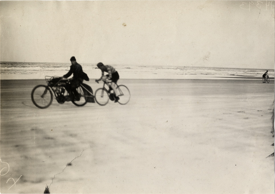 Bicyclist following Indian motorcycle, 1908 Ormond-Daytona races