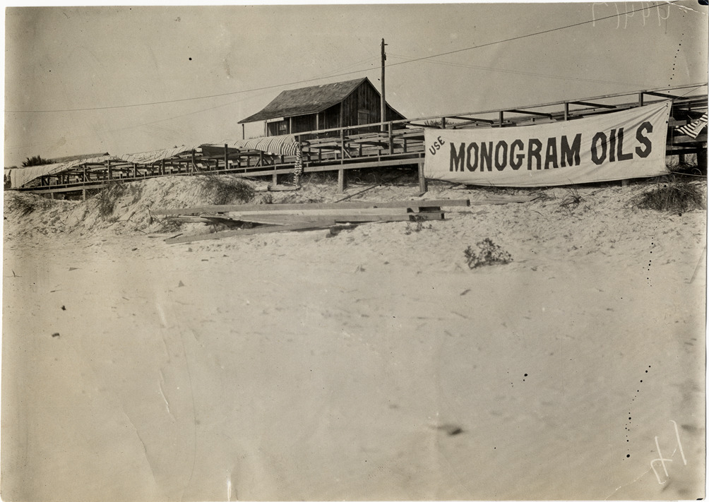 View of "Use Monogram oils" banner displayed on boardwalk railing during the 1908 Ormond-Daytona races in Florida. Board and batten wooden-frame building in background. Handwritten on back: "Races and racing--Ormond-Daytona, 1908."