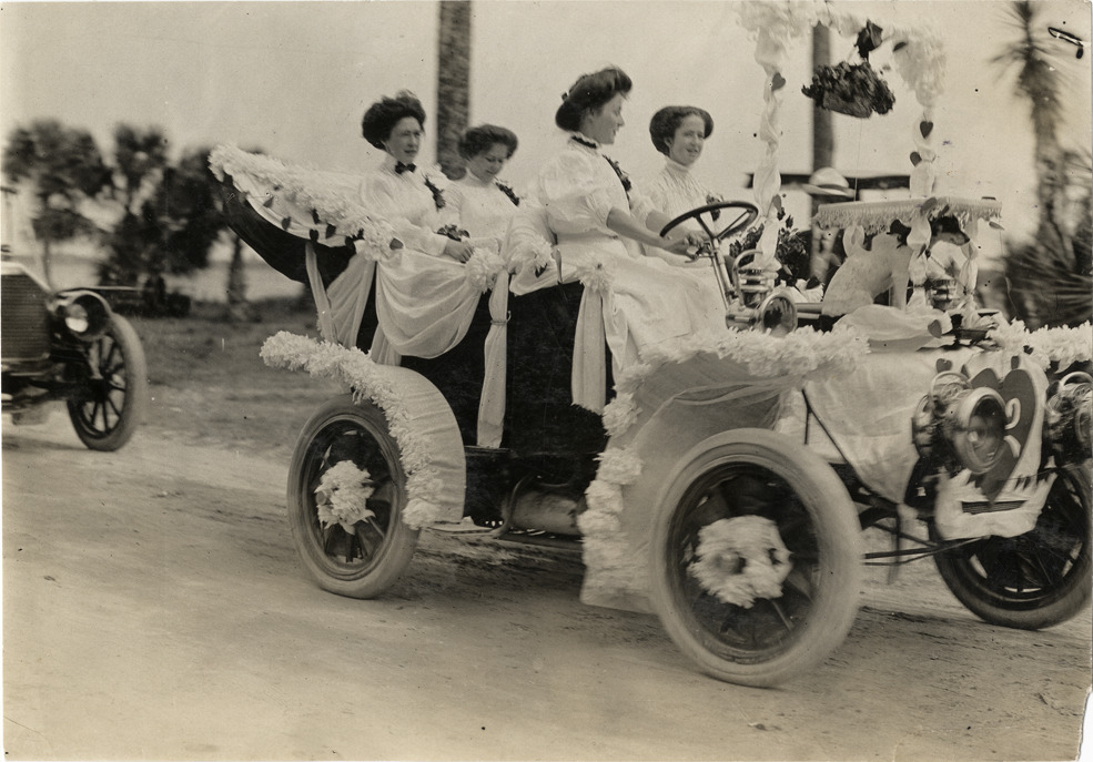 Women motorists in decorated automobile, 1908 Ormond-Daytona races
